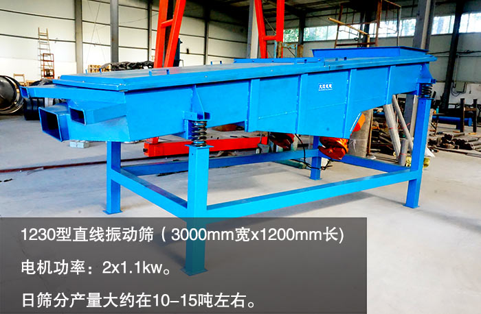 1230型直線振動(dòng)篩(3000mm寬x1200mm長),電機(jī)功率:2x1.1kw。日篩分產(chǎn)量大約在10-15噸左右。