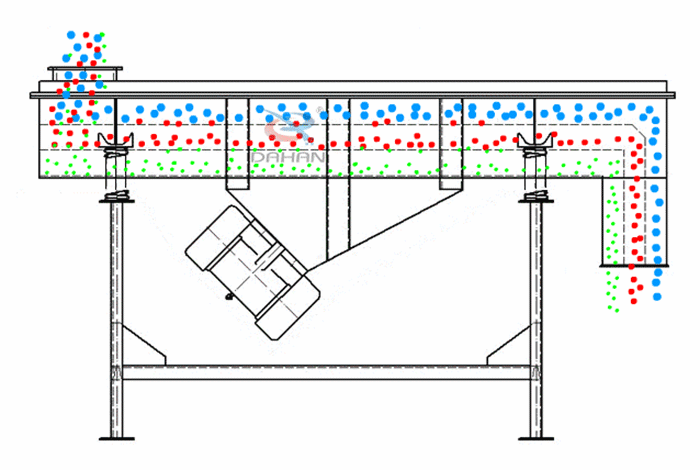 當葵花籽經由直線振動篩入料口進入直線振動篩篩面上時,直線振動篩利用其雙臺電機的激振力及葵花籽自身的重力作用,使得葵花籽在篩面上被拋起并向前運動,小于篩面孔徑的葵花籽落入篩面下層,大于篩面孔徑的葵花籽在跳動,不同規格的葵花籽分別從各自的出口排出,以此完成整個篩分除雜過程。