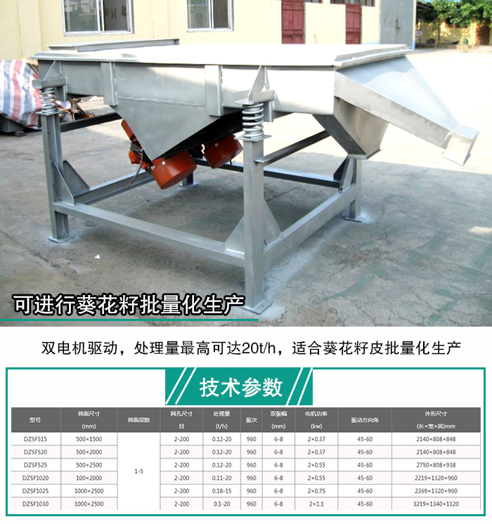 如果您對于葵花籽有多種粒度要求,新鄉大漢直線振動篩篩面可有1~5層不同設計,可以同時分選2~6種不同粒度規格的葵花籽,篩分效率高,而且直線振動篩采用雙電機驅動,處理量高可達20t/h,適合葵花籽皮批量化生產。