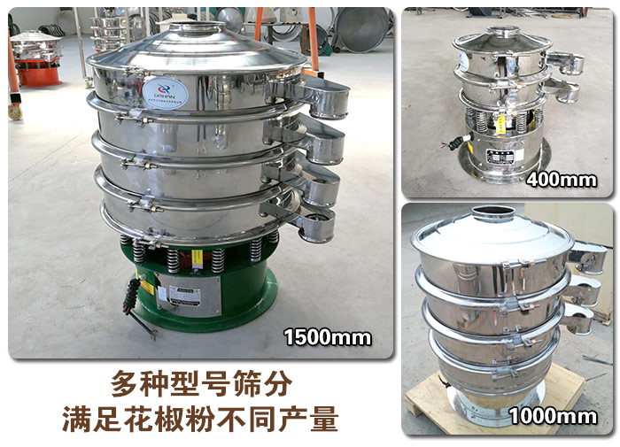 花椒粉不銹鋼振動篩的型號分為直徑400mm型、600mm型、800mm型、1000mm型、1200mm型、1500mm型、1800mm型、2000mm型等八種標準機型。