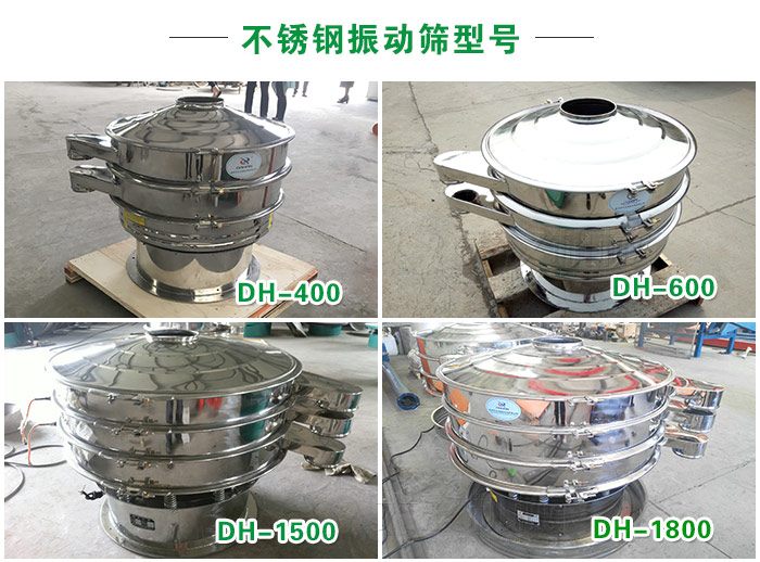 不銹鋼振動篩型號齊全,型號有DH400、DH600、DH800、DH1000、DH12000、DH1500、DH18000等,可滿足客戶對于玉米粉產量的不同需求,平均篩分產量為時篩10噸左右!