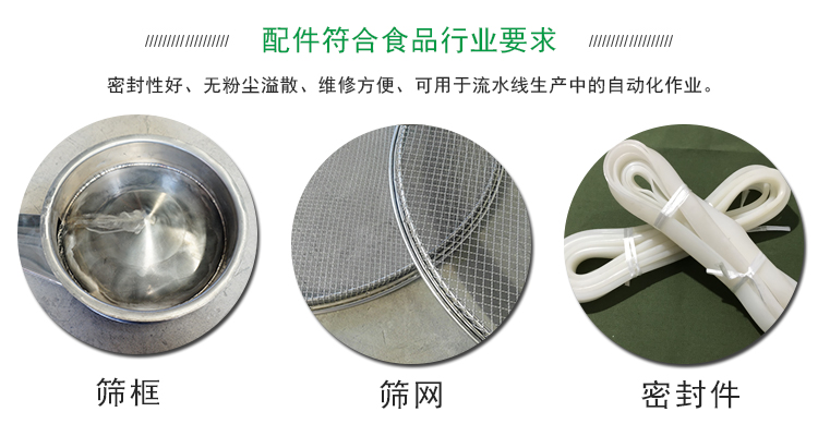 食品不銹鋼振動篩所使用的配件如篩網(wǎng)、軟連接、密封件等,為了符合食品行業(yè)要求,篩網(wǎng)要采用高質(zhì)量的不銹鋼材質(zhì),軟連接與密封件要選擇硅膠材質(zhì),硅膠材質(zhì)的密封件具有良好的耐用性和衛(wèi)生性。