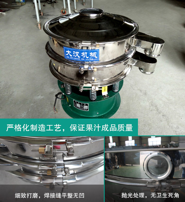 整機(jī)精選304不銹鋼材質(zhì),篩機(jī)全部進(jìn)行拋光處理,無(wú)衛(wèi)生死角,篩框的焊接處要求進(jìn)行打磨,焊接縫平整無(wú)凹點(diǎn),完全符合果汁行業(yè)對(duì)于衛(wèi)生的要求及標(biāo)準(zhǔn)。