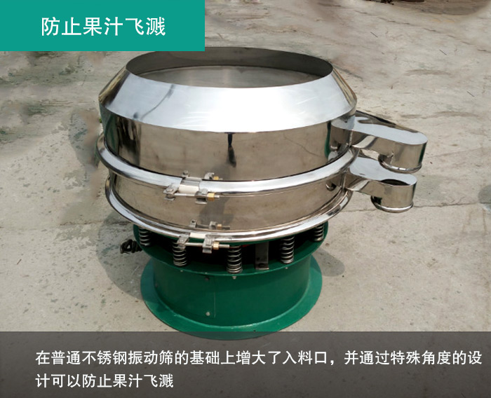 在果汁過(guò)濾環(huán)節(jié),常常有用戶反應(yīng)會(huì)出現(xiàn)液體飛濺等現(xiàn)象,效果很不好,為此大漢在不銹鋼振動(dòng)篩基礎(chǔ)上設(shè)計(jì)了一款專用于液體過(guò)濾的振動(dòng)篩——加緣式振動(dòng)篩,它是在普通不銹鋼振動(dòng)篩的基礎(chǔ)上增大了入料口,并通過(guò)特殊角度的設(shè)計(jì)可以防止液體類物料飛濺,非常適合果汁類的過(guò)濾除雜。